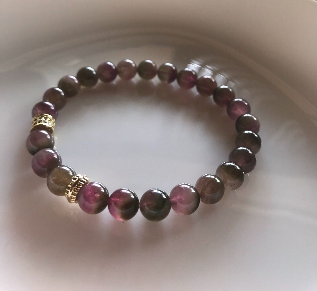 色んな色味のあるトルマリンですが、こちらはレアで可愛いバイカラー、中にはトライカラーもあるウォーターメロントルマリンのブレスです。