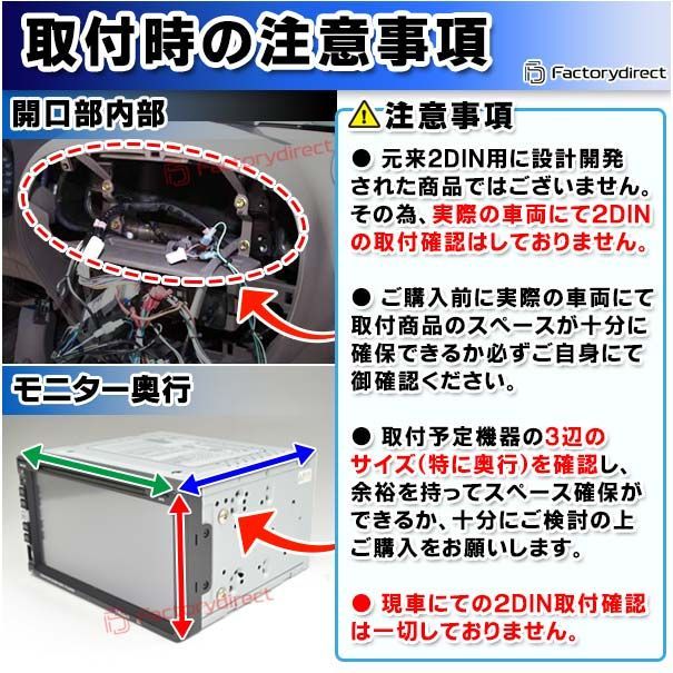 その為実際の車両にて2DINナビの取付確認は一切行っておりません。ご自身にて事前にスペース等の確認を必ず行ってください。