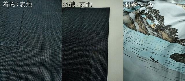 羽織の状態は接写画像のように表地所々に薄い汚れ、羽裏に薄いアクがございます。