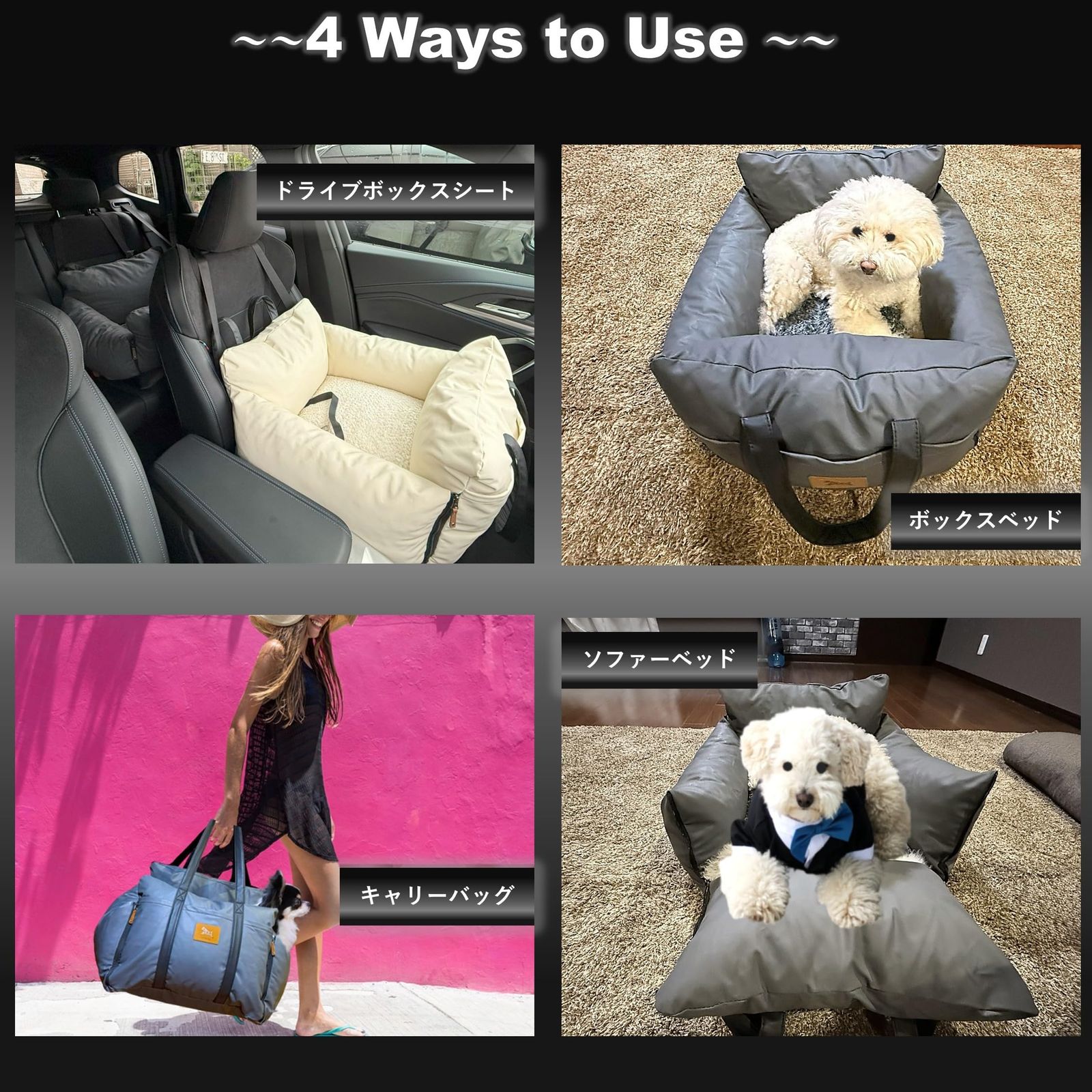 ☆ ドライブボックスシートとしてだけで無く、到着後には愛犬はそのまま入れたままキャリーバッグとして!また、ベッドとしてや、ファスナーを開いてちょっと広めのソファーベッドとしてもご使用頂けます。