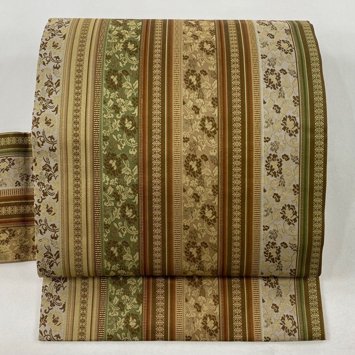 名古屋帯 秀品 花唐草 縞 薄茶色 正絹