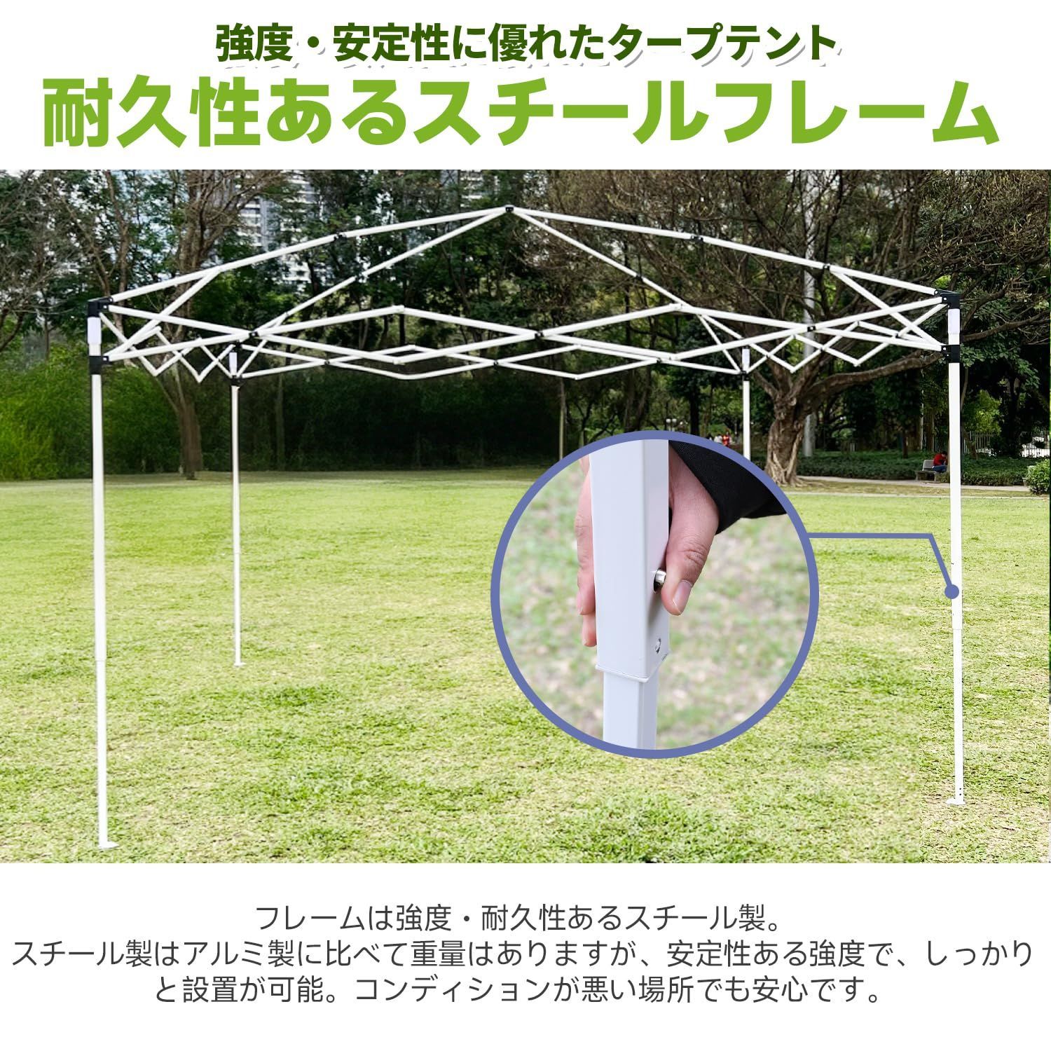 強度と耐久性に優れたスチール製フレーム、テントの構造安定性がよくなり、耐荷重も高くなりました。 高品質の防水生地を採用して、シルバーコーティング加工を施して、遮熱性、防水性がアップします、UVカットなど様々な機能を搭載。さわやかで快適な日よけの空間を提供します。