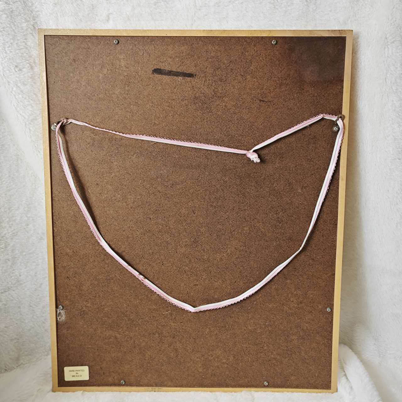 メキシコの伝統的なフォークアート(民芸品)であるアマテ紙絵画です。ピンクと青の鳥が、鮮やかな極彩色で描かれた花や葉の間に舞う様子がモチーフとなっています。独特の質感を持つアマテ紙(イチジクの樹皮から作られる紙)が使用されており、プリミティブでエキゾチックな雰囲気を持ちます。木製の額縁に入った壁飾りとして、お部屋を明るく彩ります。