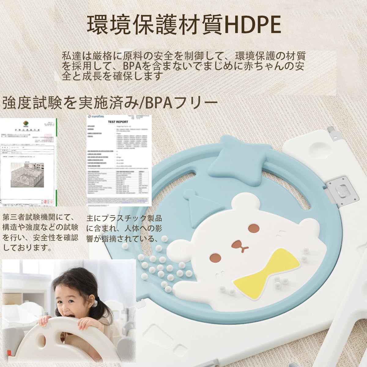 【安全な設計】超巨大なゲームのフェンスはCPCの標準に符合して、高密度のポリエチレンプラスチックで作られて、無毒で且つ摩耗に強いです。折りたたみ式のゲームフェンスは、下部がアップグレードされた吸盤でできているため、赤ちゃんや幼児用のゲームフェンスが地面にしっかりと固定され、転倒しにくくなっています。
