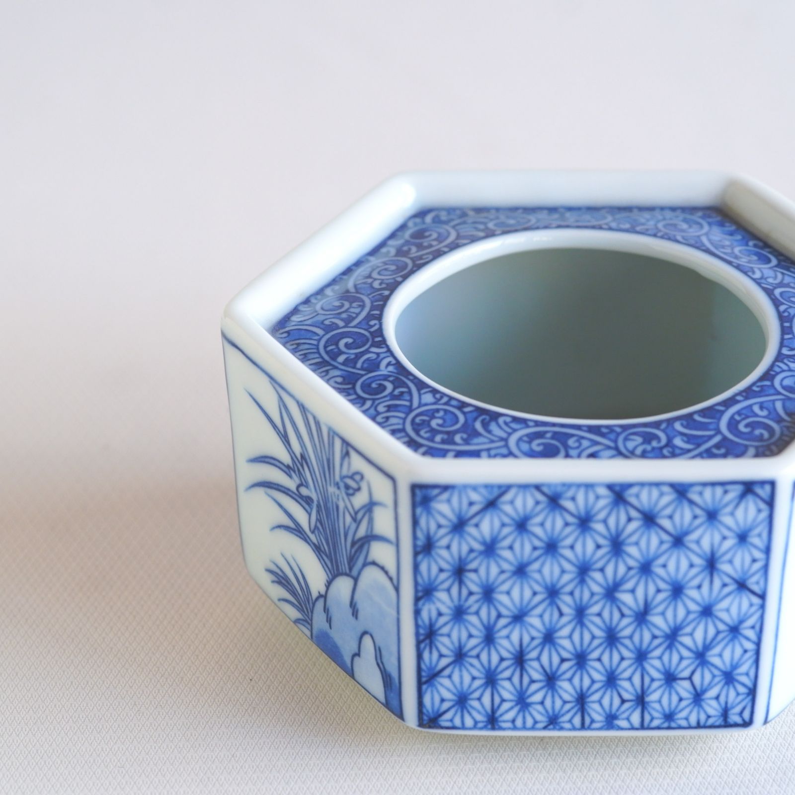 六角形の中に描かれた、青海波や網目、可憐な花文。細やかな筆致が生む伝統の文様は、ひとつに重なり、美しい調べを奏でます。