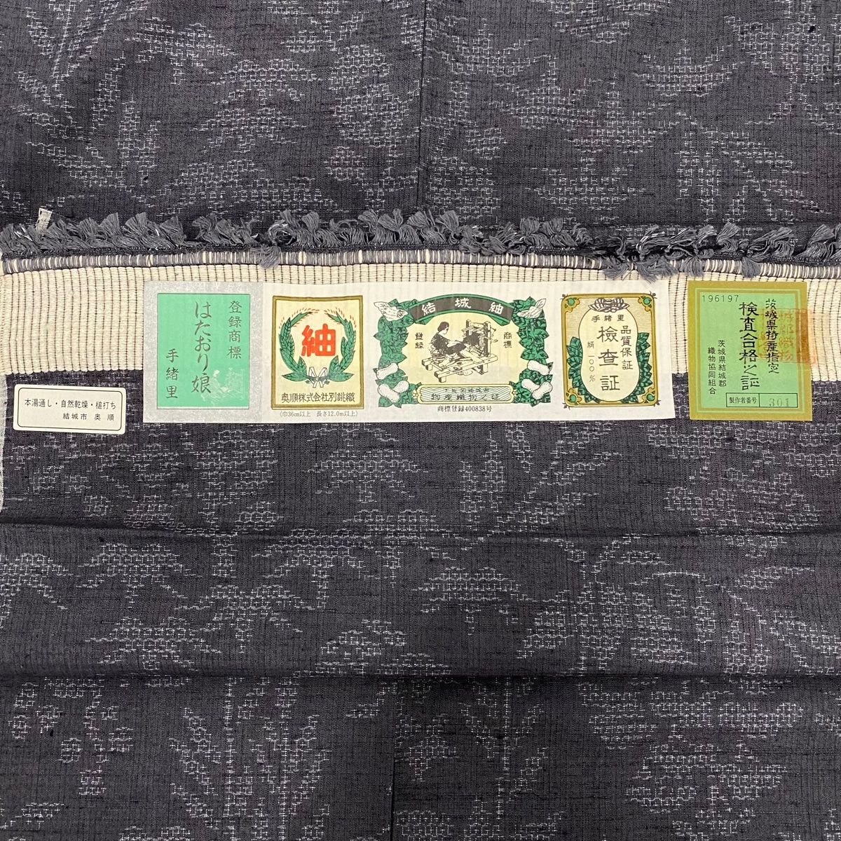 結城紬 身丈157 cm 裄丈64.5 M 袷 はたおり娘 奥順 証紙 草花 亀甲絣 灰色 正絹