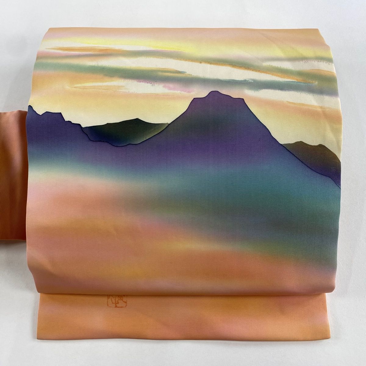 名古屋帯 秀品 落款 本郷大田子 山並み 霞 ぼかし 薄オレンジ 正絹