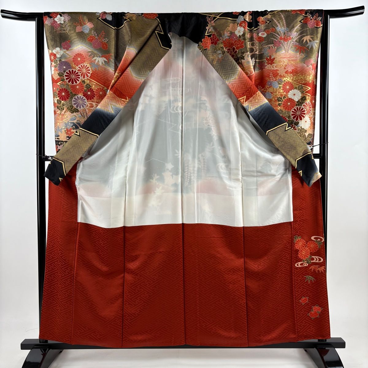 振袖 身丈160 cm 裄丈63 S 袷 菊 流水 金糸 金彩 茜色 正絹 秀品