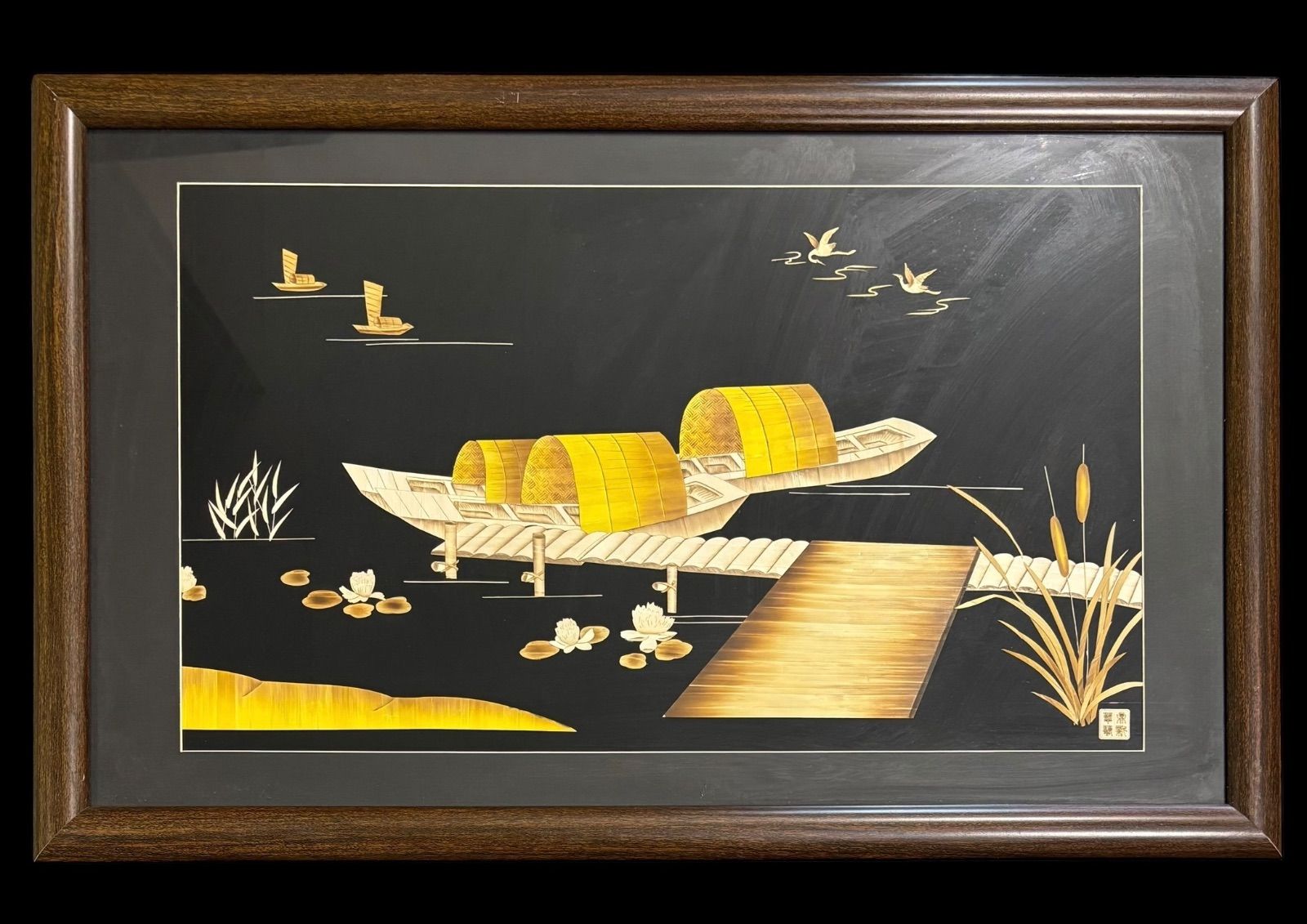 中国現地買入 架け橋 船 切り絵 貼り絵 中国 鳥 蓮 風景 額 版画 アート イラスト 中国雑貨 アンティーク