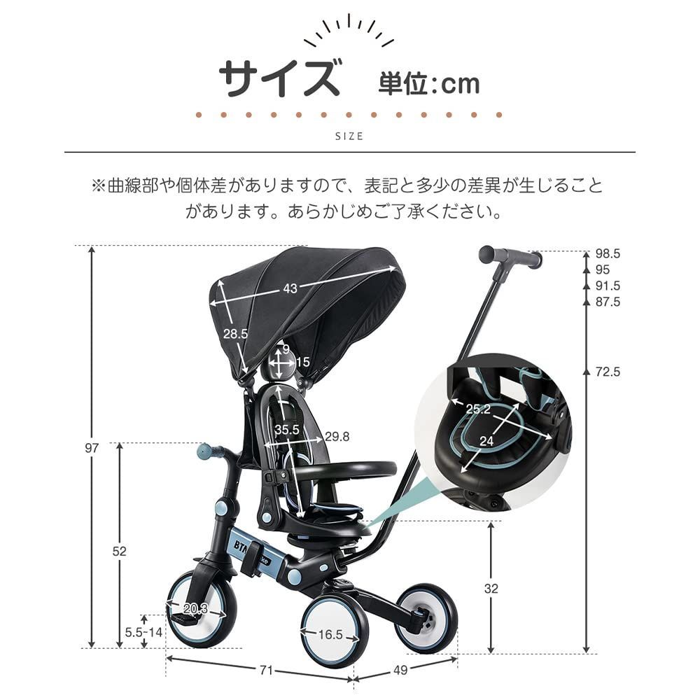 point 1.お子様の成長に合わせて長く楽しめる 対面向き:6~12ヶ月 対面式で親子のコミュニケーションがアップできるし、赤ちゃんに十分な安心感も与えられます。 三輪車(押し棒&背もたれ&ベルト付き):1~2歳 子供が自由に歩ける前通常の三輪車としてお使いいただけます。 スデップに足を置けるので、ペダルに足が届かなくても大丈夫。 安全ガード付き三輪車:2~3歳 三輪車に慣れる前に360°お子様を落下から守れます。 押し棒付き三輪車:2~3歳 保護者の方が進行方向を決めて動かすことができす。公園や近所のお散歩時などに使用します。 三輪車:3~4歳 かじとり押し棒を外して、通常の三輪車としてお使いいただけます。 バランスバイク:4~5歳 バランスやコントロールを身につけられ、自転車に乗るための練習用として最高です。 自転車:5-6歳 ペダルを前輪につけてこぎながらバランスをとる練習ができます。 point 2.簡単に折りたためる 折りたたむとコンパクトになるので、ご家庭の保管も場所を取らず、車にもらくらくと積み込めます。車にもらくらくと積み込めます。 point 3.機能満載 ①前輪と連動できるコントロールバー 前輪上のボタンを押し、泥除けの短い側を本体側に向いて、押し棒が前輪と連動し移動できます。 ②ペダルの巻き込み防止 押し棒を使う際はペダルを空回りにしておけば足を挟んでしまうことを防げます。 ③角度調整可能な背もたれ 両側のボタンを押すと、背もたれの角度が調整可能です。 ④5段階調節可能なかじとり押し棒 心地よい素材を採用し、操作をもっとやすくなります。 ⑤後輪ストッパー 坂道やお子さまが誤って動かそうとしても車体は動かないので安心です。 ⑥便利な収納バッグ 出かける時は、おもちゃ、カップなどの小物もたっぶり入れます。 ご注意:収納バッグの耐荷重は2kgでございます。 ⑦シートベルト・安全ガード 走行時の揺れによりずり落ちるなどの事故からお子様を守ります。 ⑧細部にもこだわり 6段階調整可能なハンドル 折りたため・取り外し可能なサンシェード 安全性と実用性が両立する後輪部分の設計 発泡EVA、空気入れ必要なし