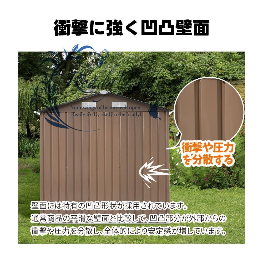 【衝撃に強く壁面&人字形の排水屋根】 壁面には特有の凹凸形状の設計で、通常商品の平滑な壁面と比較して、凹凸部分が外部からの衝撃や圧力を分散し、安定感が増しています。亜鉛メッキ鋼板採用、粉体塗装仕上げでは環境に配慮し、有害物質を発生させず、衝撃に強く耐錆性を持ちます。特にの外部に防水処理を施し、悪天候下でも内部が乾燥した状態を維持します。それに屋根は本体よりも広く、人字形斜面が設けられています。雨、雪が降ると、屋根にたまることなく、斜面と凹槽を経由して地面に流れ落ちます。全体には防水、防錆、紫外線と褪色防止の優れた性能があり、長期間の屋外使用に適しています