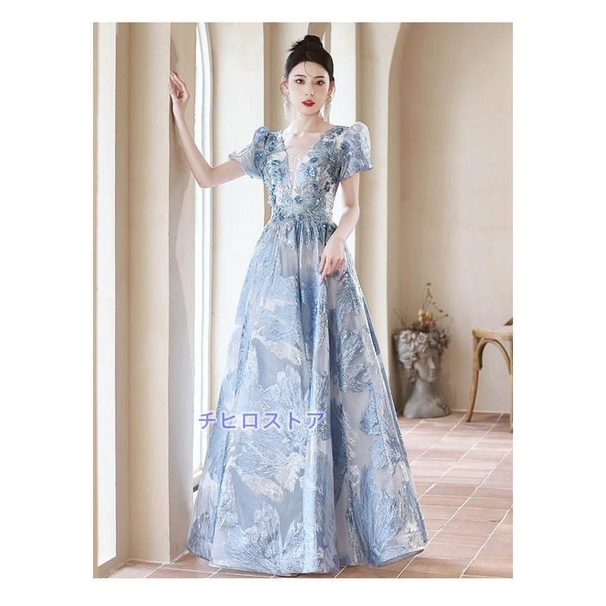ロングドレス 演奏会 ピアノ 発表会 キラキラ スパンコール 花刺繍 花柄 レース ブルードレス 袖あり 5分袖 フェミニン エレガント大きいサイズ