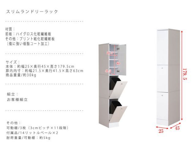 サイズ本体:約幅25×奥行45×高さ179.5cm扉内内寸:約幅21.5×奥行41.5×高さ63cm商品重量/約30kg