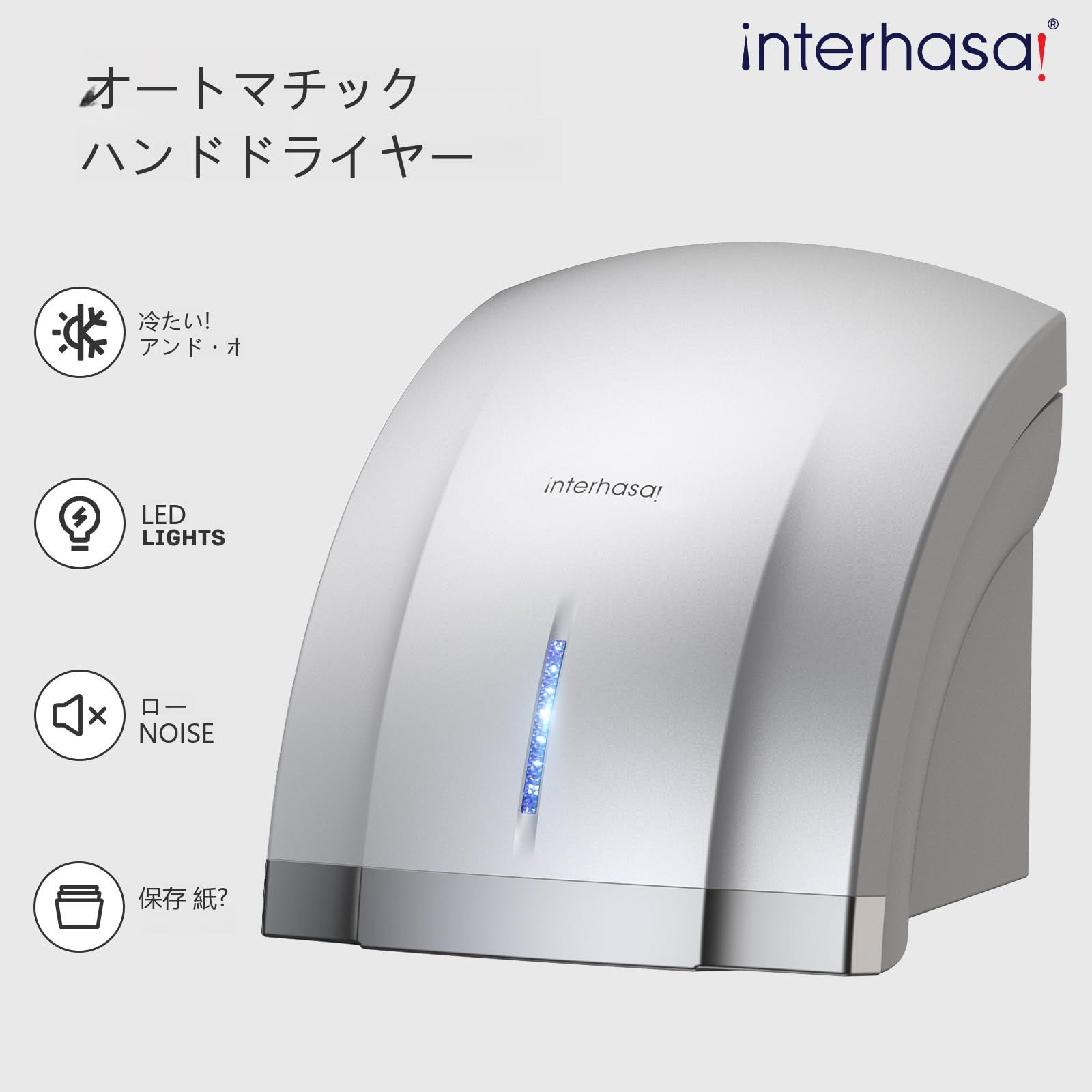 interhasa ハンドドライヤー 壁掛け式 小型 コンパクト 家庭用 業務用兼用 速乾 1800 W 自動冷風 温風切替 省エネ 静音設計 シルバー