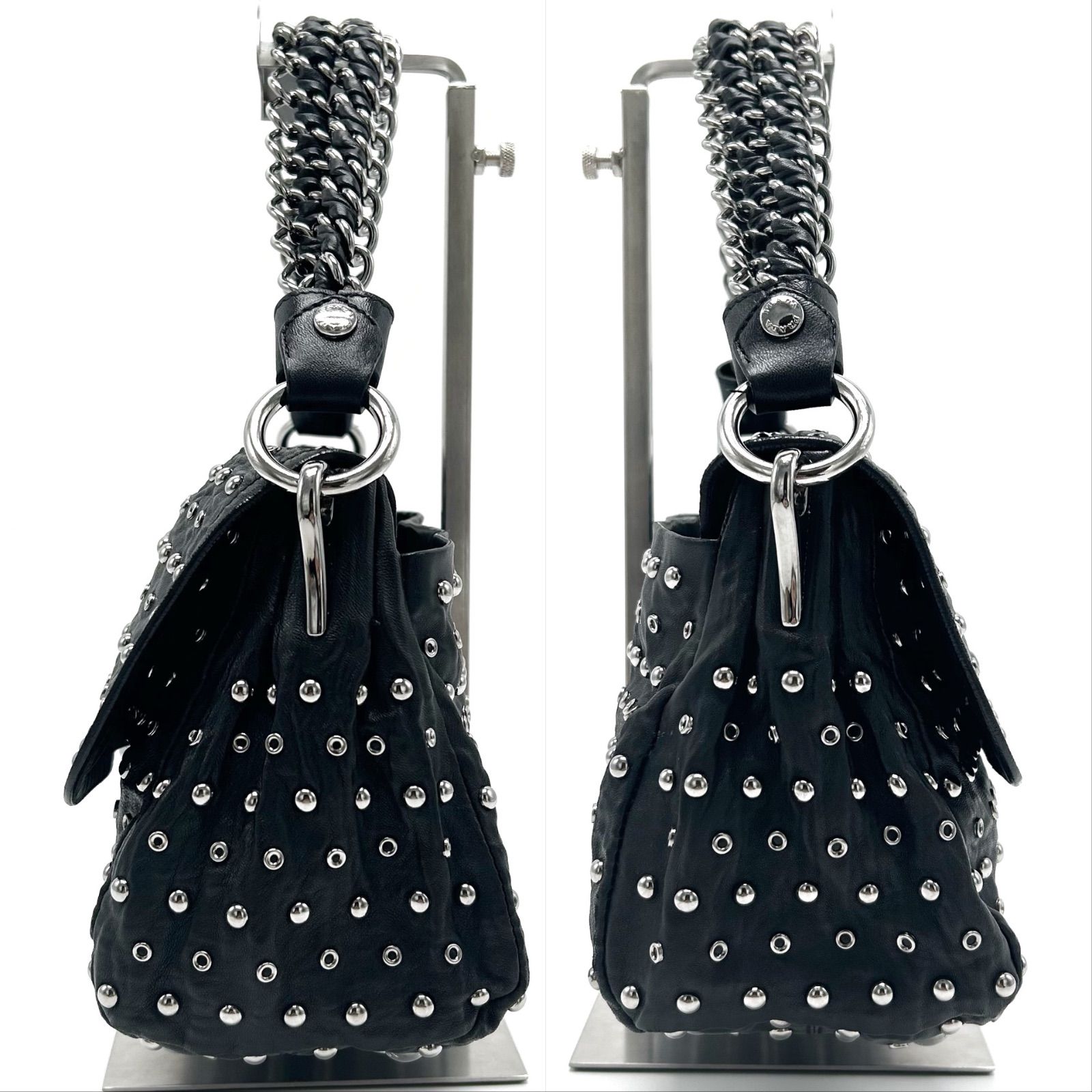品 PRADA プラダ スタッズ チェーン ハンドバッグ ショルダー 肩掛け シルバー金具 白タグ有 ギャランティーカード レザー ブラック メンズ レディース ユニセックス