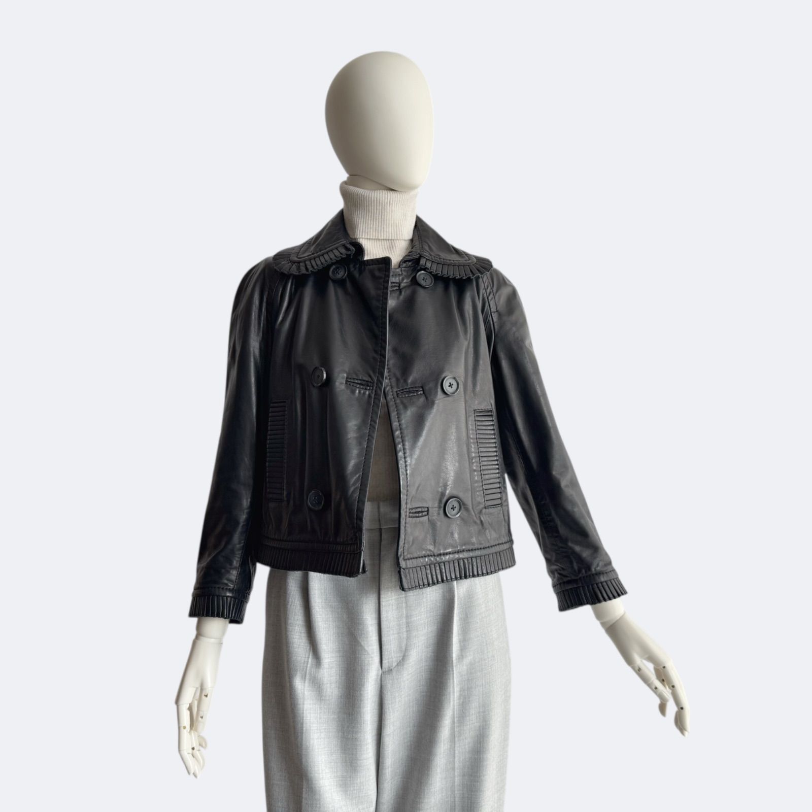 襟・袖口・裾にはプリーツ調のレザー装飾を施し、細部まで丁寧に仕上げられたイタリア製ならではの美しいデザイン。