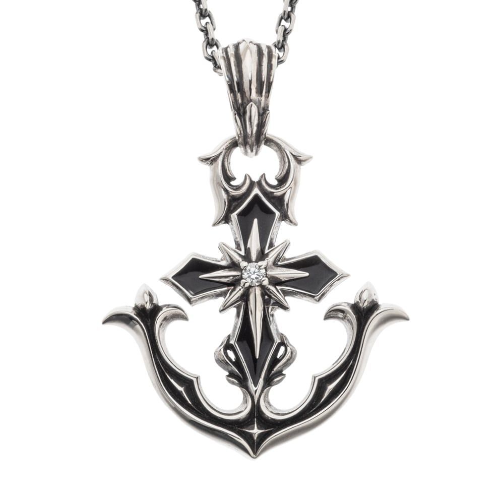 荒海に船を留めるアンカーを、端正な意匠で胸元へ。逆境に揺るがない“支え”を象るモチーフを、重厚と優雅のバランスで描いた一本です。錨のフレームに、漆黒のエナメルで縁取ったクロスを重ね、中心には北極星を思わせるスターを配して凛とした輝きを添えました。面と曲線の切り替えが光を拾い、角度ごとに陰影が立ち上がる立体的な仕上がり。素材はSV925。アトリエで地金を成形し、エナメルを丁寧に流し、丹念に磨き上げています。指先に伝わる滑らかさと、視線を射抜くシャープなエッジは、職人の手仕事の証。裏面にはブランド名と〈925〉の品質刻印を刻み、確かなクオリティを約束します。