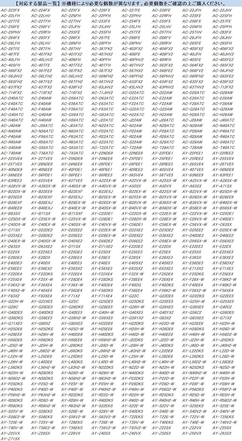 【対応する製品一覧】AC-223FX、AC-224FX、AC-225FX、AC-226FX、AC-227FE、AC-228FE、AC-22JFH、AC-22JHV、AC-22LFH、AC-22LHV、AC-22NFH、AC-22PFH、AC-22PHV、AC-22RFH、AC-22SFE、AC-22SFH、AC-22TFE、AC-22TFH、AC-22THV、AC-253FX、AC-254FX、AC-255FX、AC-256FX、AC-257FE、AC-258FE、AC-258FV、AC-25JFH、AC-25JHV、AC-25LFH、AC-25LHV、AC-25NFH、AC-25PFH、AC-25PHV、AC-25RFH、AC-25SFE、AC-25SFH、AC-25TFE、AC-25TFH、AC-25THV、AC-283FX、AC-284FX、AC-285FX、AC-286FX、AC-287FE、AC-288FE、AC-288FV、AC-28JFH、AC-28JHV、AC-28LFH、AC-28LHV、AC-28NFH、AC-28PFH、AC-28PHV、AC-28RFH、AC-28SFE、AC-28SFH、AC-28TFE、AC-28TFH、AC-28THV、AC-367FK2、AC-403FX2、AC-404FX2、AC-405FX2、AC-406FX2、AC-407FE、AC-407FK2、AC-407FX2、AC-407HX2、AC-408FE、AC-408FV2、AC-40JFH、AC-40JHV2、AC-40LFH、AC-40LHV2、AC-40NFH、AC-40PFH、AC-40PHV2、AC-40RFH、AC-40SFE、AC-40SFE2、AC-40SFH、AC-40TFE、AC-40TFE2、AC-40TFH、AC-40THV2、AC-563FX2、AC-564FX2、AC-565FX2、AC-566FX2、AC-567FE2、AC-567FK2、AC-567FX2、AC-567HX2、AC-568FE2、AC-568FV2、AC-56JFH2、AC-56JHV2、AC-56LFH2、AC-56LHV2、AC-56NFH2、AC-56PFH2、AC-56PHV2、AC-56RFH2、AC-56SFE2、AC-56SFH2、AC-56TFE2、AC-56TFH2、AC-56THV2、AC-633FX2、AC-634FX2、AC-635FX2、AC-636FX2、AC-637FK2、AC-637FX2、AC-638FV2、AC-63JHV2、AC-63LHV2、AC-63PHV2、AC-63THV2、AC-713FX2、AC-714FX2、AC-715FX2、AC-716FX2、AC-71JHV2、AC-D22ATC、AC-D22AW、AC-D28ATC、AC-D28AW、AC-D40ATC、AC-D40AW、AC-D56ATC、AC-D63ATC、AC-E22ATC、AC-E22AW、AC-E28ATC、AC-E28AW、AC-E40ATC、AC-E40AW、AC-E56ATC、AC-E63ATC、AC-F22ATC、AC-F22AW、AC-F28ATC、AC-F28AW、AC-F40ATC、AC-F40AW、AC-F56ATC、AC-F63ATC、AC-G22ATC、AC-G22AW、AC-G28ATC、AC-G28AW、AC-G40ATC、AC-G40AW、AC-G56ATC、AC-G63ATC、AC-H22ATC、AC-H22AW、AC-H28ATC、AC-H28AW、AC-H40ATC、AC-H40AW、AC-H56ATC、AC-J22ATC、AC-J22AW、AC-J28ATC、AC-J28AW、AC-J40ATC、AC-J40AW、AC-J56ATC、AC-J63ATC、AC-N22ATC、AC-N22AW、AC-N28ATC、AC-N28AW、AC-N40ATC、AC-N40AW、AC-N56ATC、AC-N63ATC、AC-P22ATC、AC-P22AW、AC-P28ATC、AC-P28AW、AC-P40ATC、AC-P40AW、AC-P56ATC、AC-P63ATC、AC-R22ATC、AC-R22AW、AC-R28ATC、AC-R28AW、AC-R40ATC、AC-R40AW、AC-R56ATC、AC-R63ATC、AC-S22ATC、AC-S22AW、AC-S28ATC、AC-S28AW、AC-S40ATC、AC-S40AW、AC-S56ATC、AC-S63ATC、AC-T22ATC、AC-T22AW、AC-T28ATC、AC-T28AW、AC-T40ATC、AC-T40AW、AC-T56ATC、AC-T63ATC、AY-22NDE9、AY-22NEE9、AY-22PDE1、AY-22PEE1、AY-22REE3、AY-22SVE4、AY-22TVE5、AY-25NDE9、AY-25NEE9、AY-25PDE1、AY-25PEE1、AY-25REE3、AY-25SVE4、AY-25TVE5、AY-28NDE9、AY-28NEE9、AY-28PDE1、AY-28PEE1、AY-28REE3、AY-28SVE4、AY-28TVE5、AY-40NDE9、AY-40NEE9、AY-40PDE1、AY-40PEE1、AY-40REE3、AY-40SVE4、AY-40TVE5、AY-56NDE9、AY-56NEE9、AY-56PDE1、AY-56PEE1、AY-56REE3、AY-56SVE4、AY-56TVE5、AY-63NEE9、AY-63PEE1、AY-63REE3、AY-63SVE4、AY-63TVE5、AY-A22SX-W、AY-A22VX-W、AY-A25SX-W、AY-A25VX-W、AY-A28SX-W、AY-A28VX-W、AY-A36SX-W、AY-A40SX-W、AY-A40VX-W、AY-A50SX、AY-A50VX、AY-A63SX、AY-A71SX、AY-B22DX-W、AY-B22EE9、AY-B22EXF、AY-B22EXJ、AY-B22EX-W、AY-B22SX-W、AY-B22VX-W、AY-B25DX-W、AY-B25EE9、AY-B25EXF、AY-B25EXJ、AY-B25EX-W、AY-B25SX-W、AY-B25VX-W、AY-B28DX-W、AY-B28EE9、AY-B28EXF、AY-B28EXJ、AY-B28EX-W、AY-B28SX-W、AY-B28VX-W、AY-B36SX-W、AY-B36VX-W、AY-B40DX-W、AY-B40EE9、AY-B40EXJ、AY-B40EX-W、AY-B40SX-W、AY-B40VX-W、AY