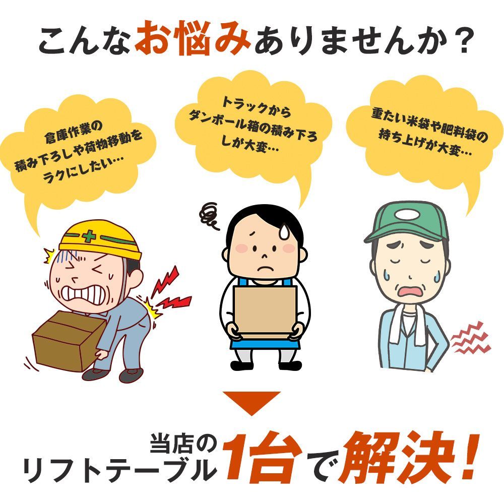 【こんなお悩みありませんか?】倉庫作業の積み下ろしや荷物移動をラクにしたい…トラックからダンボール箱の積み下ろしが大変…重たい米袋や肥料袋の持ち上げが大変…当店のリフトテーブル1台で解決!