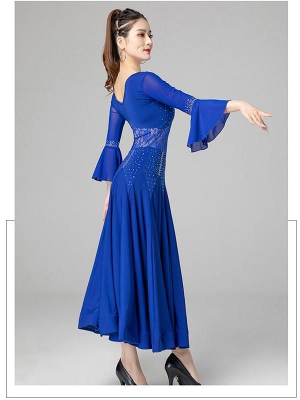 ダンス衣装 ダンスウェア ステージ衣装 カラオケ デモ パーティー 練習着 演出 ブラック ブルー 社交ダンスドレス 社交ダンス モダンドレス 大きいサイズ 長袖 広がる裾 ドレス ワルツダンス ワンピースドレス