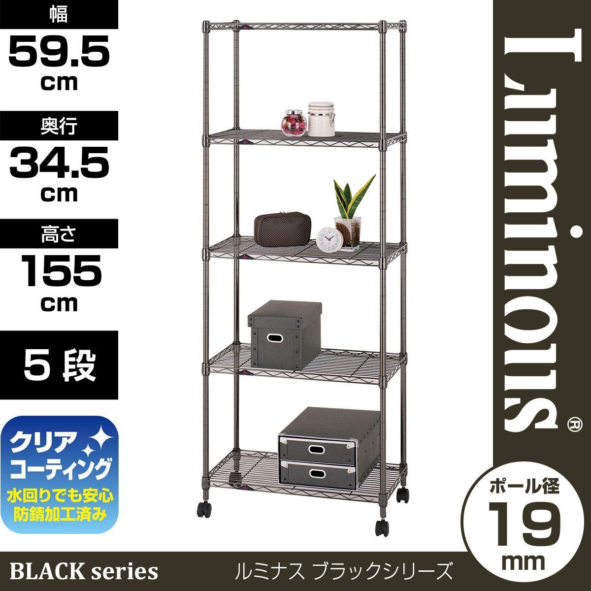 ドウシシャ ルミナス ブラック 幅60 5段 スチールラック 収納棚 艶のある黒色 幅59.5×奥行34.5×高さ155 cm 全体耐荷重400 kg 頑丈 キャスター付き 防錆加工 ポール径19 mmパーツ対応 業務用 シェルフ キッチン収納