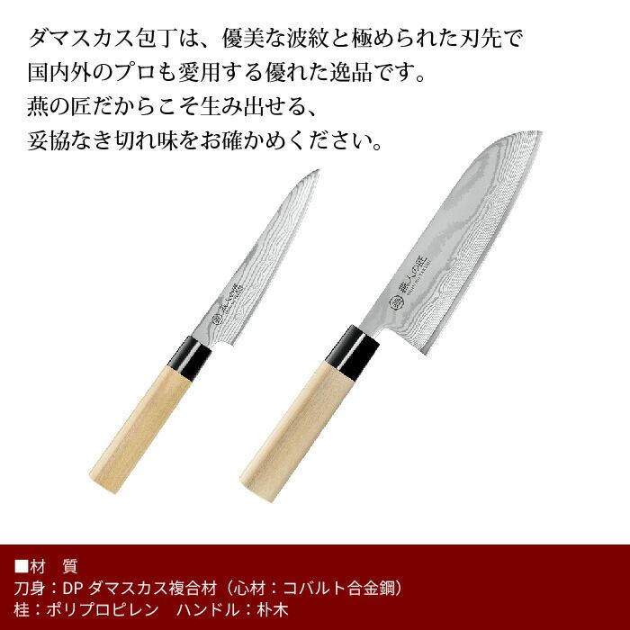 燕の匠技が光る「燕人の匠シリーズ」のダマスカス包丁セット。優美な波紋と鋭い切れ味で、国内外のプロも愛用する逸品です。刀身には63層のDPダマスカス割込鋼を使用し(※ペティナイフは37層)、家庭用でも抜群の使いやすさと切れ味を両立。和包丁の基本に則ったハンドル構造で、使うほどに愛着が増す日本伝統文化の結晶。三徳包丁は肉・魚・野菜に幅広く使え、ペティナイフは皮むきや飾り切りに最適です。
