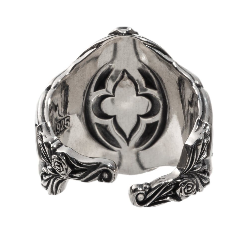 漆黒の楕円石に浮かぶ六芒星が、堂々たる存在感を放つシグネットリング。トップには厚みのある六芒星を立体で配し、外周には繊細な唐草を一周。要所にあしらったクリアCZがほのかな輝きを添え、燻しを効かせたSV925が陰影豊かなコントラストを描きます。サイドは緻密なトレサリーの彫刻、内側にはブランドロゴと“925”、さらに教会文様のモチーフをデザイン。六芒星は天と地、物質と精神の調和を象徴し、古来より護符として敬愛されたシンボル。ブランド監修とクラフトを融合し、提携アトリエで完成させた渾身作です。ユニセックスに映えるバランスで、日常からドレススタイルまで。一本で装いの核となる、威厳とモードが同居するアートピース。