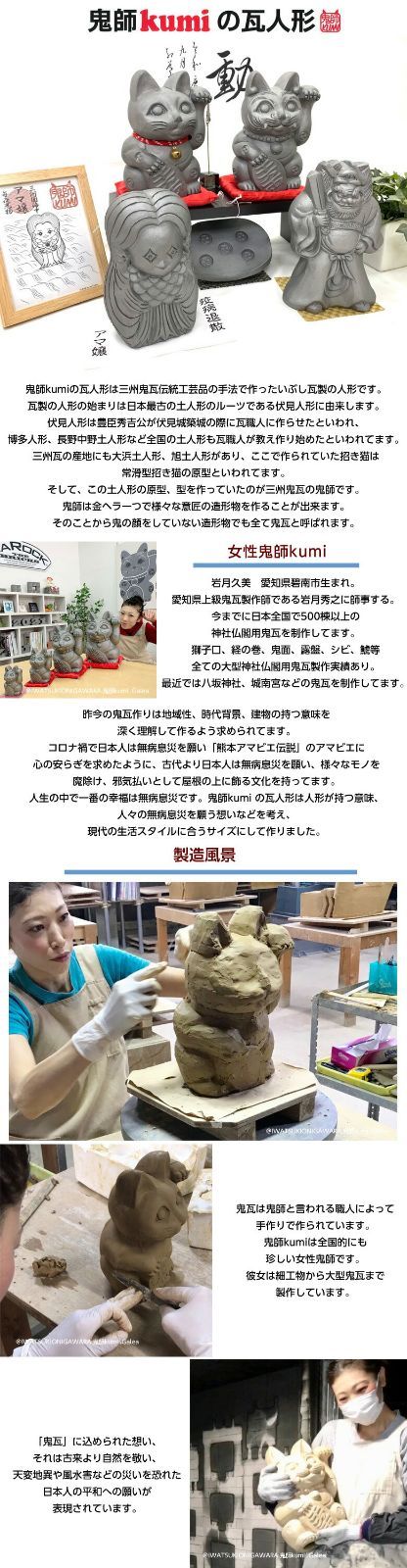 商品説明:招鬼猫は鬼師kumiが「三州鬼瓦伝統的工芸品」の手法で制作したいぶし瓦製招き猫です。
