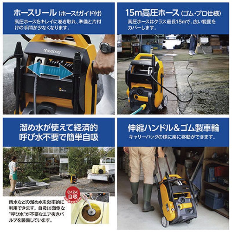 水冷式モーター採用で静音性と耐久性を両立した家庭用高圧洗浄機。エア抜き不要のバルブ式自吸機能により溜水も利用可能で経済的。自動車・バイク・壁・玄関・厨房床・農業機械・建設機械など幅広く対応。住宅地でも気兼ねなく使える静音設計。15m高圧ホースはガイド付きリールでスッキリ収納。伸縮式ハンドルで省スペース収納&キャリーバッグ感覚で移動も快適。取扱説明書をよく読み、正しくご使用ください。