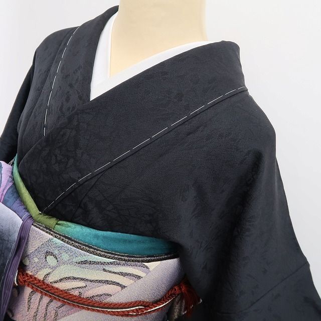 お着物は、黒地に大胆に配した斜めライン状のデザインが斬新な一枚。