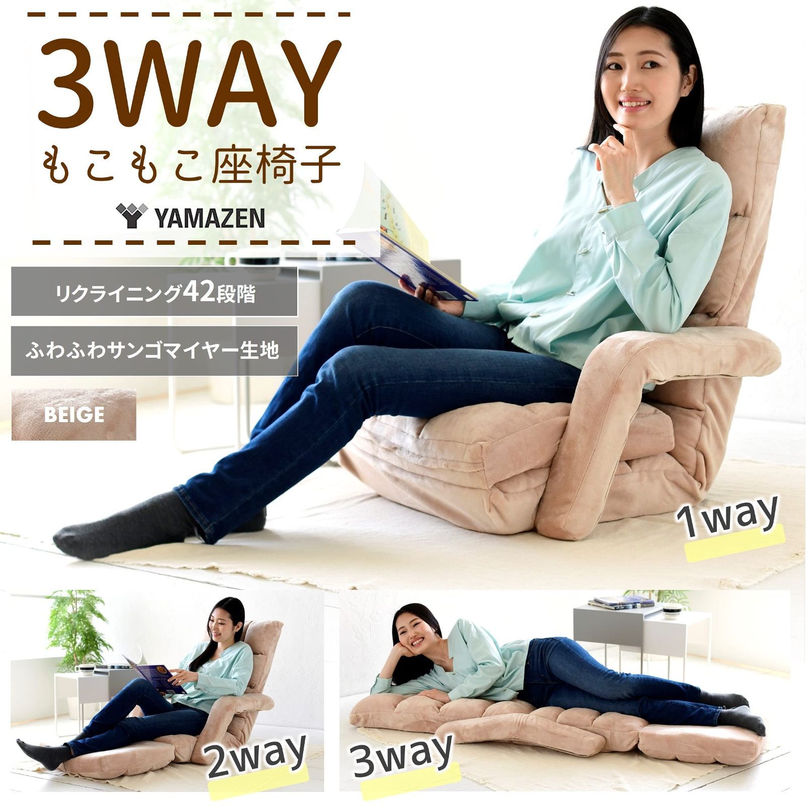 商品 ハイバック ひじ掛け付き ふわふわ素材 サンゴマイヤー生地 折りたたみ ソファー カウチ ごろ寝 幅62㎝ 3 WAY 座椅子ソファー リクライニング ベージュ 座椅子 IGHMZ-62 BE 山善 YAMAZEN テレワーク