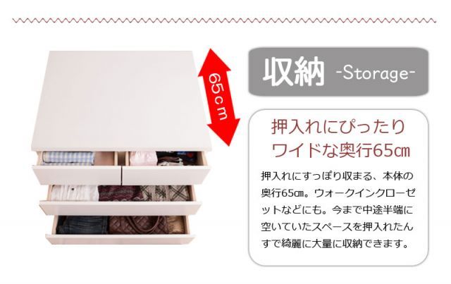 ■商品について/押入れにピッタリ納まる、押入れスペースの有効活用に大変便利なチェスト。引出しの奥行は55.5cmあるので、衣類は前後2列に収納可能。また、毛布やシーツなども収納できます。大引出しにはレールが取り付けられており、タップリ収納した引出しの開閉も楽々。、本体はキャスター付きだから、押入れからの出し入れも楽々です。