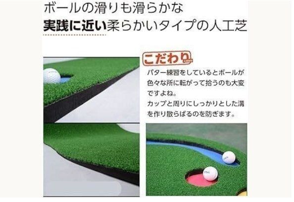 【自宅でいつでもパター練習】 お部屋にマット広げるだけで本格的なパター練習ができるゴルフマットです。 初心者の方でも人目を気にせず、寒い日でも、雨の日でも自宅で効果的なパター練習ができます。 中級者~上級者の方にもご利用して頂けるパター練習器具なので、ぜひ練習を重ねて、スキルアップ&スコアアップを目指してください。
