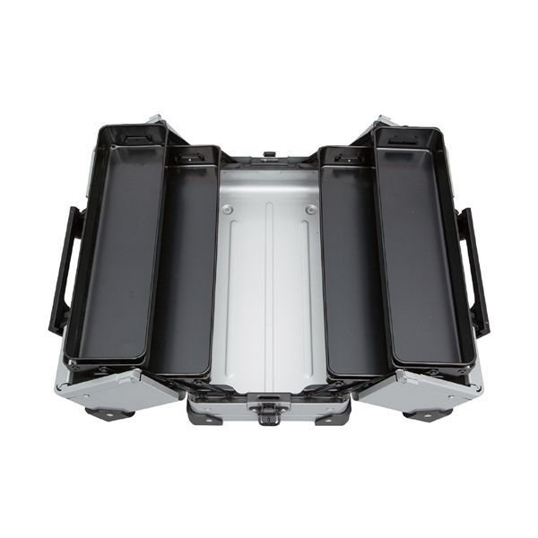 ■オープン時に内蔵されたトレイが左右に展開し、収納物を一覧できる両開きタイプの工具箱です。