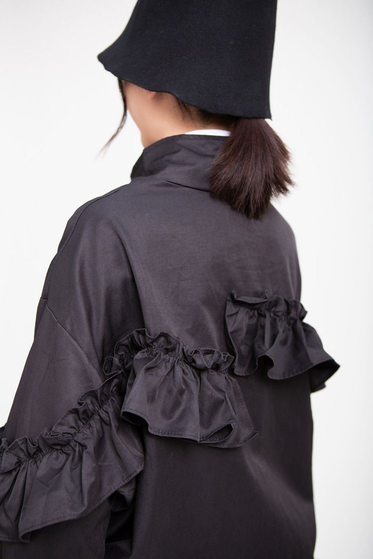 アシンメトリー フリルジャケット レディース モード系 袖フリル おしゃれ バックフリル 羽織り ジャケット ブルゾン アウター ナチュラル 大きいサイズ バルーン袖 春 冬 zhongc 07