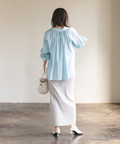 華やかな印象の着映えブラウス。すっきりとしたスキッパーの首元に長めのボウタイを添えた、抜け感がありながらもキレイ見えも叶う優秀デザイン。ギャザーを存分に寄せた緩やかなシルエットや前後差を大胆につけたヘムラインで、360度こなれた印象にアピールできるのも魅力です。ボウタイは取り外し可能なため、着こなしやシーンに合わせてお好みでアレンジ可能。そのまま垂らしたりフロントで結んだりと、これ1枚で様々な表情を楽しめるのも嬉しい。