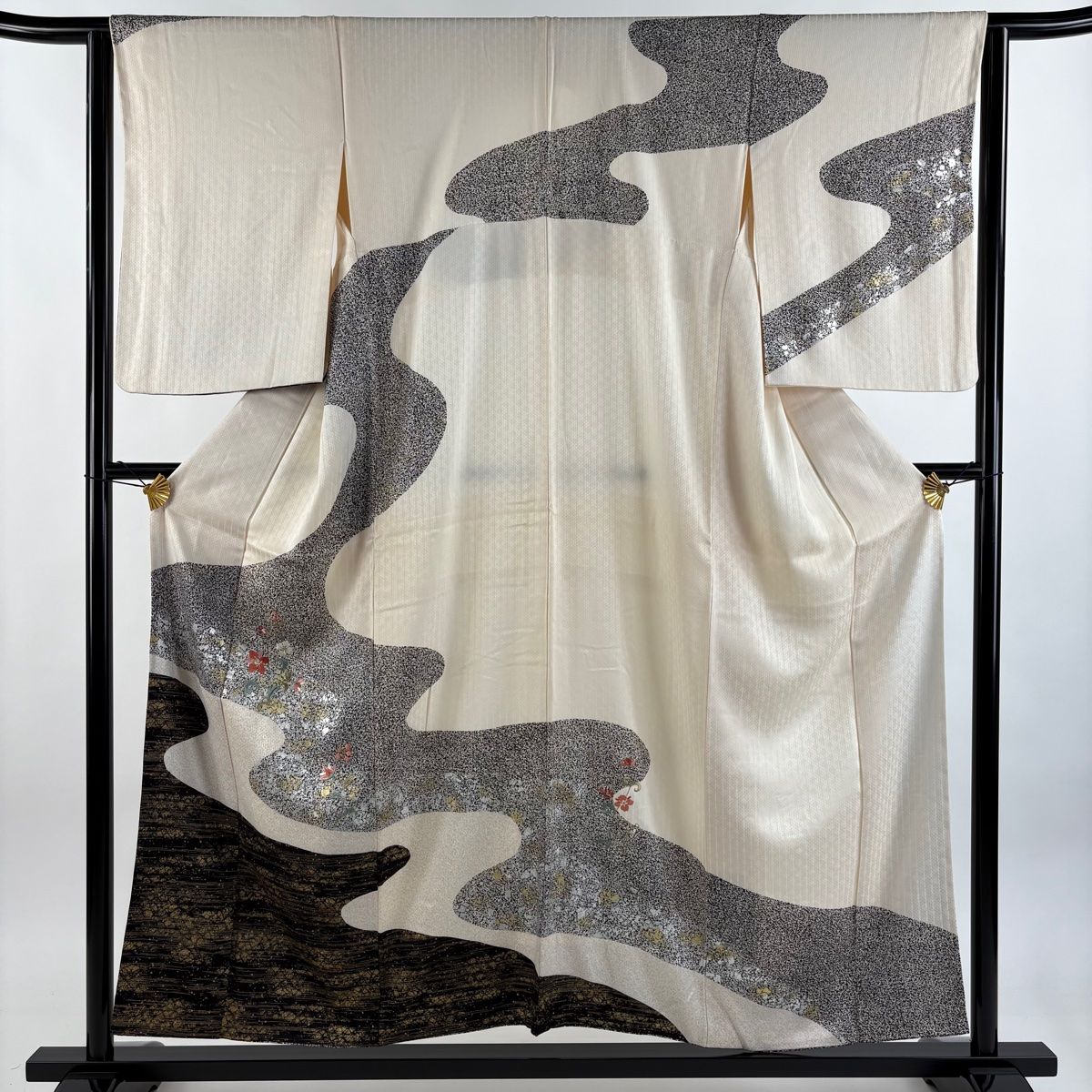 訪問着 身丈155 cm 裄丈62.5 S 袷 草花 霞 刺繍 金銀彩 ベージュ 正絹 秀品