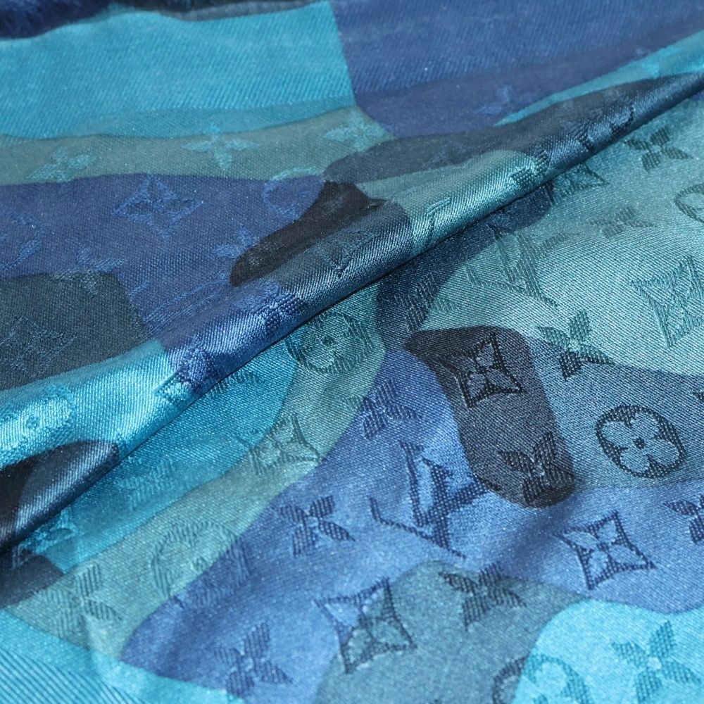 【品名】モノグラム ストール スカーフ ブルー ウール×シルク M75398