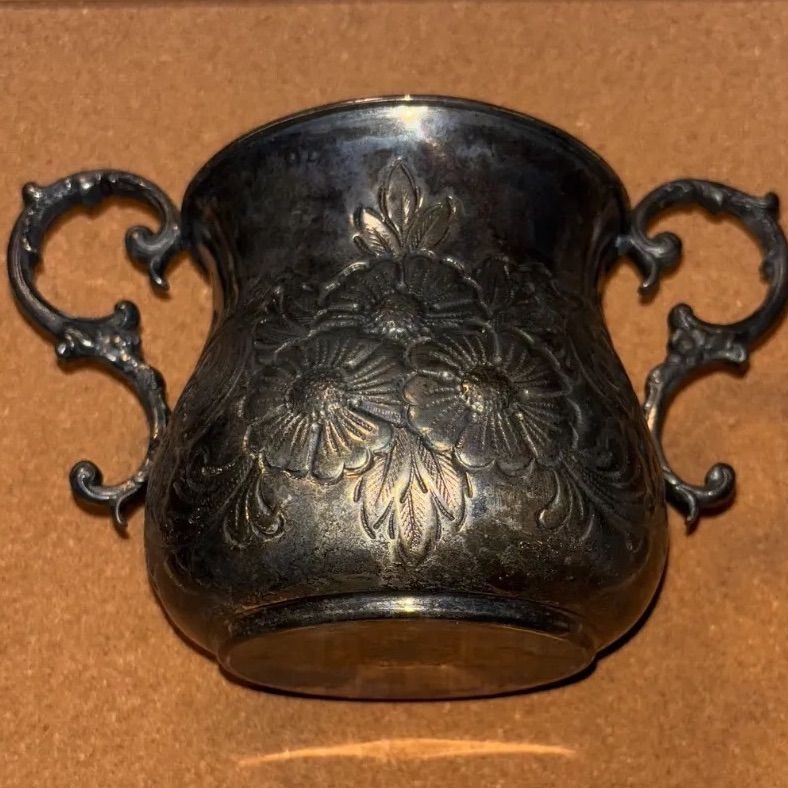 両取っ手・全面に花模様のエンボス彫刻はデザインから見ると1950〜1970年代頃のイタリア製銀細工の典型的スタイルとなります。