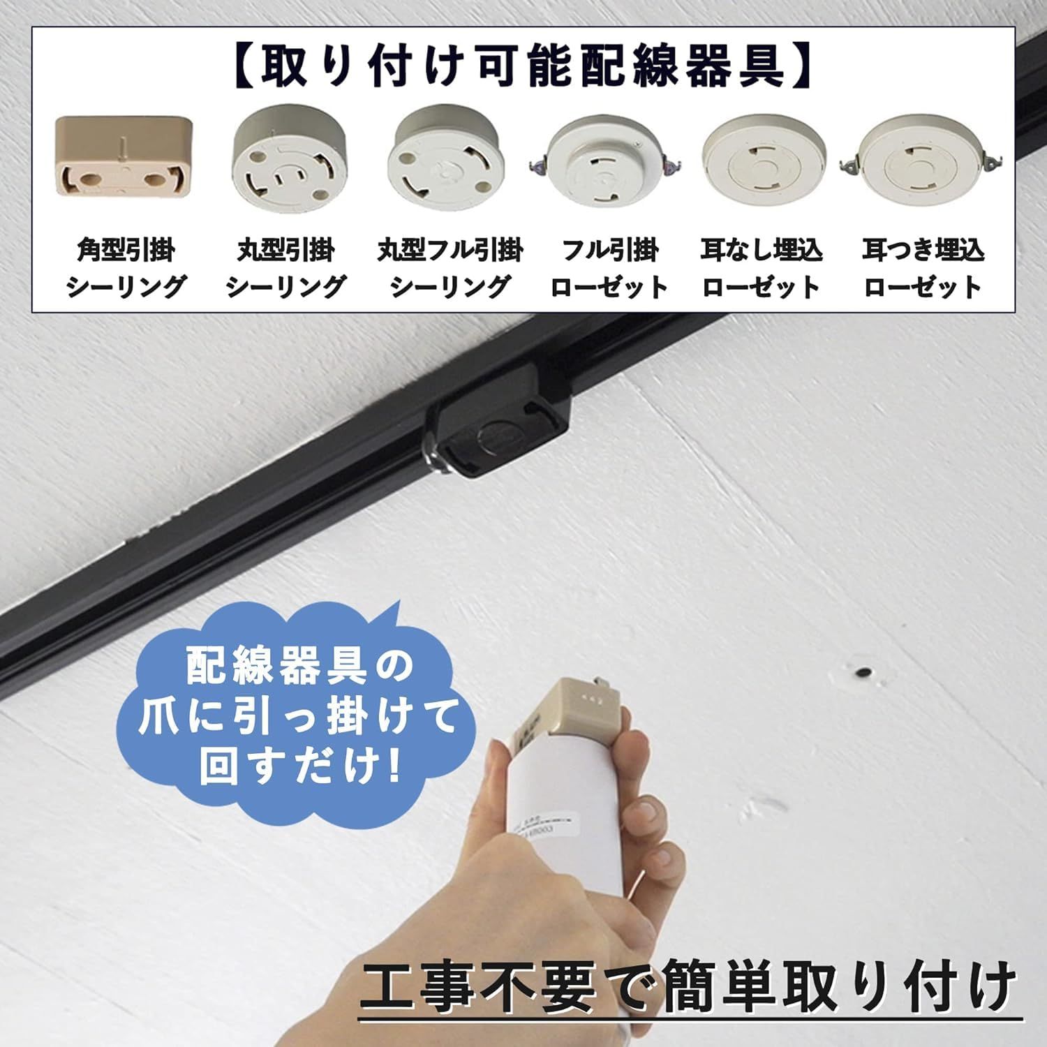角形引掛シーリング、丸型引掛シーリング、丸型フル引掛シーリング、フル引掛埋込ローゼット、引掛埋込ローゼット、引掛埋込ローゼット(ハンガーなし)。※配線器具は付属しておりません。