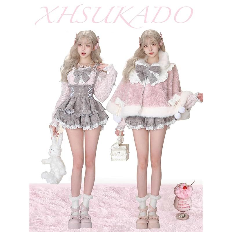 商品名:【新品】 [XHSUKADO] 3点セット レディース オープンショルダー 肩出し セーター コート ミニスカート リボン 地雷系 量産型 セットアップ ティアード ガーリー系 ロリータ モコモコ レース 夢かわいい 長袖 厚手 女の子 少女 春 秋 冬 ピン