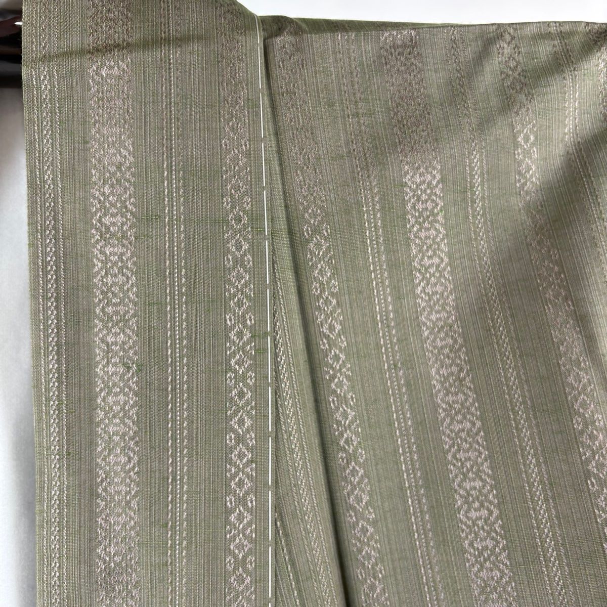 紬 身丈162 cm 裄丈66 M 袷 千年工房 黒田紬 博多織 落款 縦縞 献上柄 茶緑色 正絹