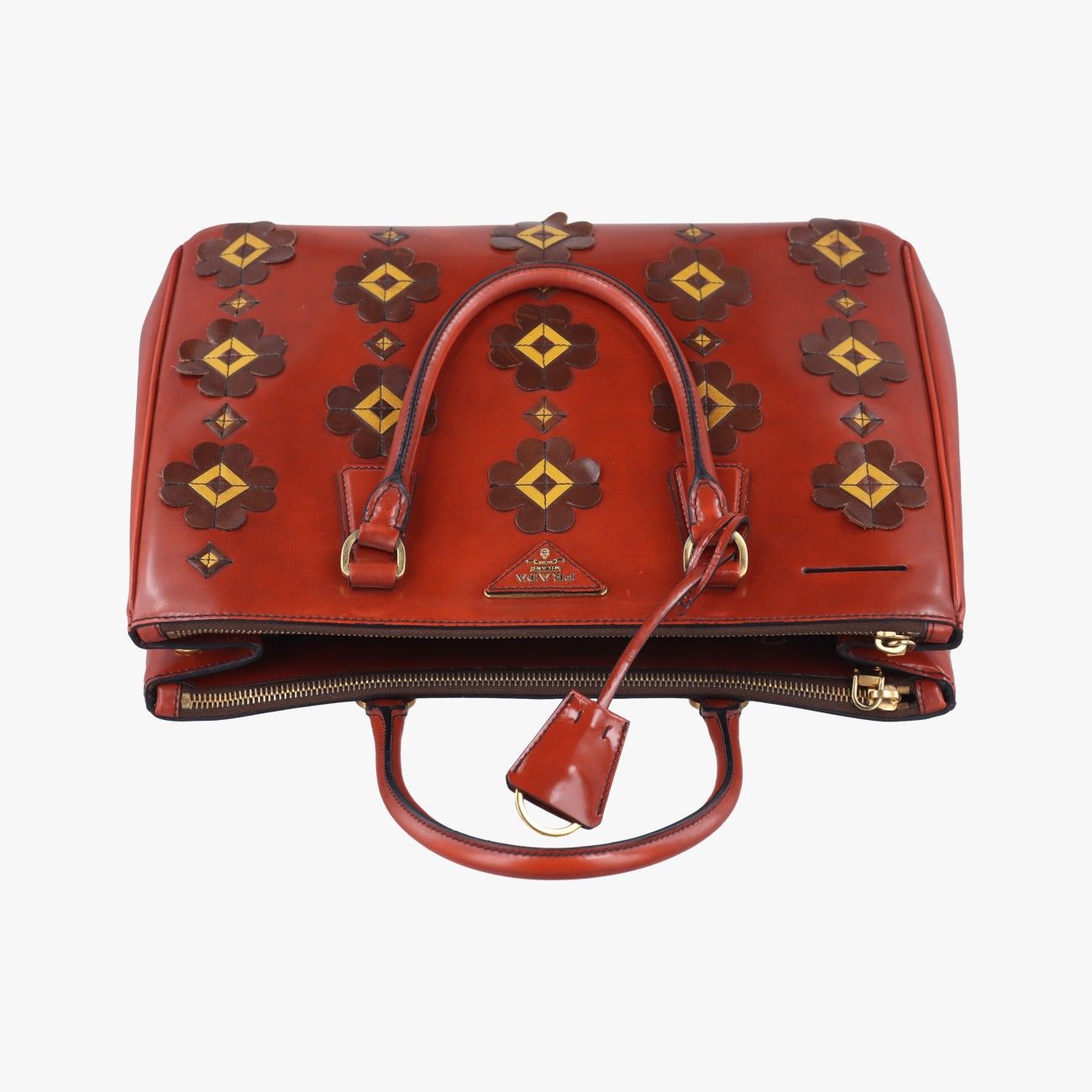 プラダPradaミディアムフローラルアップリケダブルジップレッド×ブラウン×イエローパテント