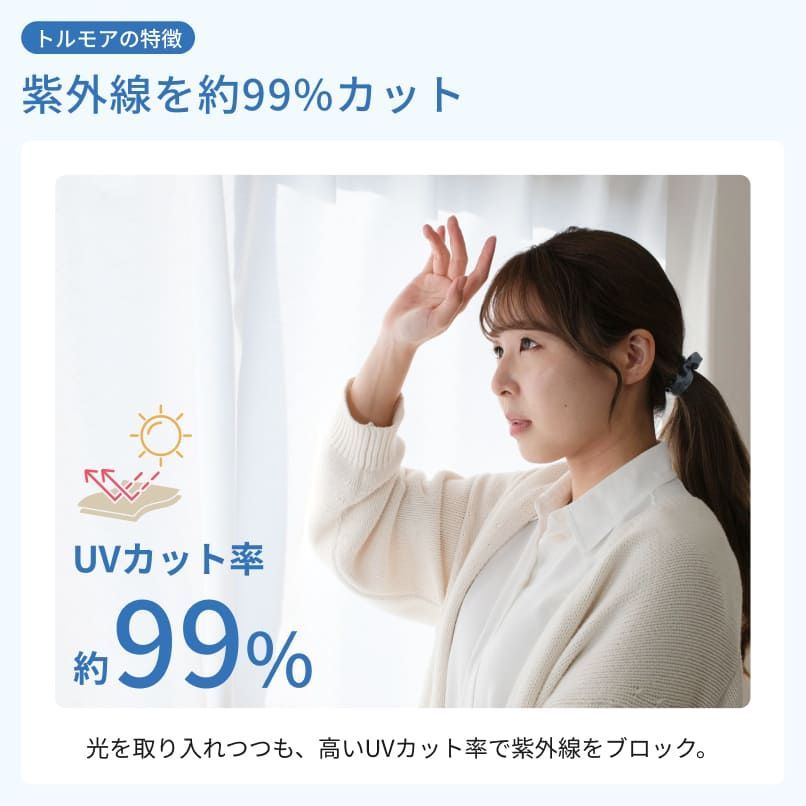 三層構造の光沢感ある生地が、紫外線(UV)をしっかりとカットし、室内や床の日焼けや色褪せを防ぎます。