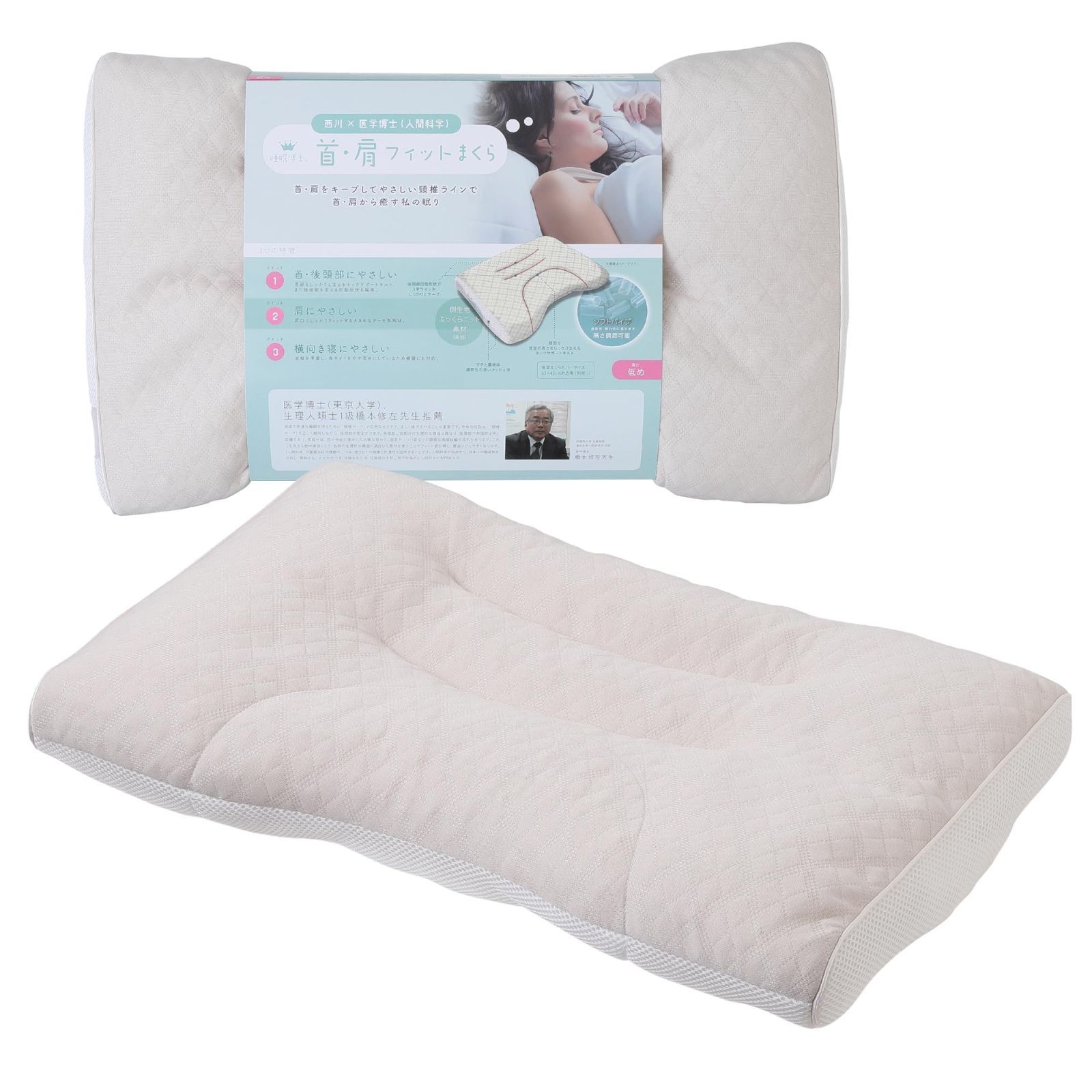 Size 低め_Style 首肩フィット_PatternName モデル nishikawa 西川 睡眠博士 首肩フィット 枕 低め 洗える 医学博士と共同開発 仰向けが多い方向け 横向き 対応 高さ調節 乾燥時間が早くなり時短 側地の柔らかさアッ