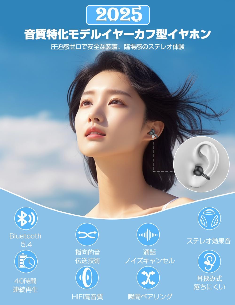 イヤホン bluetooth ワイヤレスイヤホン 音質表現に特化モデル 2025聴覚の饗宴 イヤーカフ型 5.4 臨場感あふれるリアル音質 定向音伝送技術 骨伝導の進化 耳挟み式 ゼロ圧迫設計 残量可視化 通話騒音低減 音漏れ大幅防止 脱落し