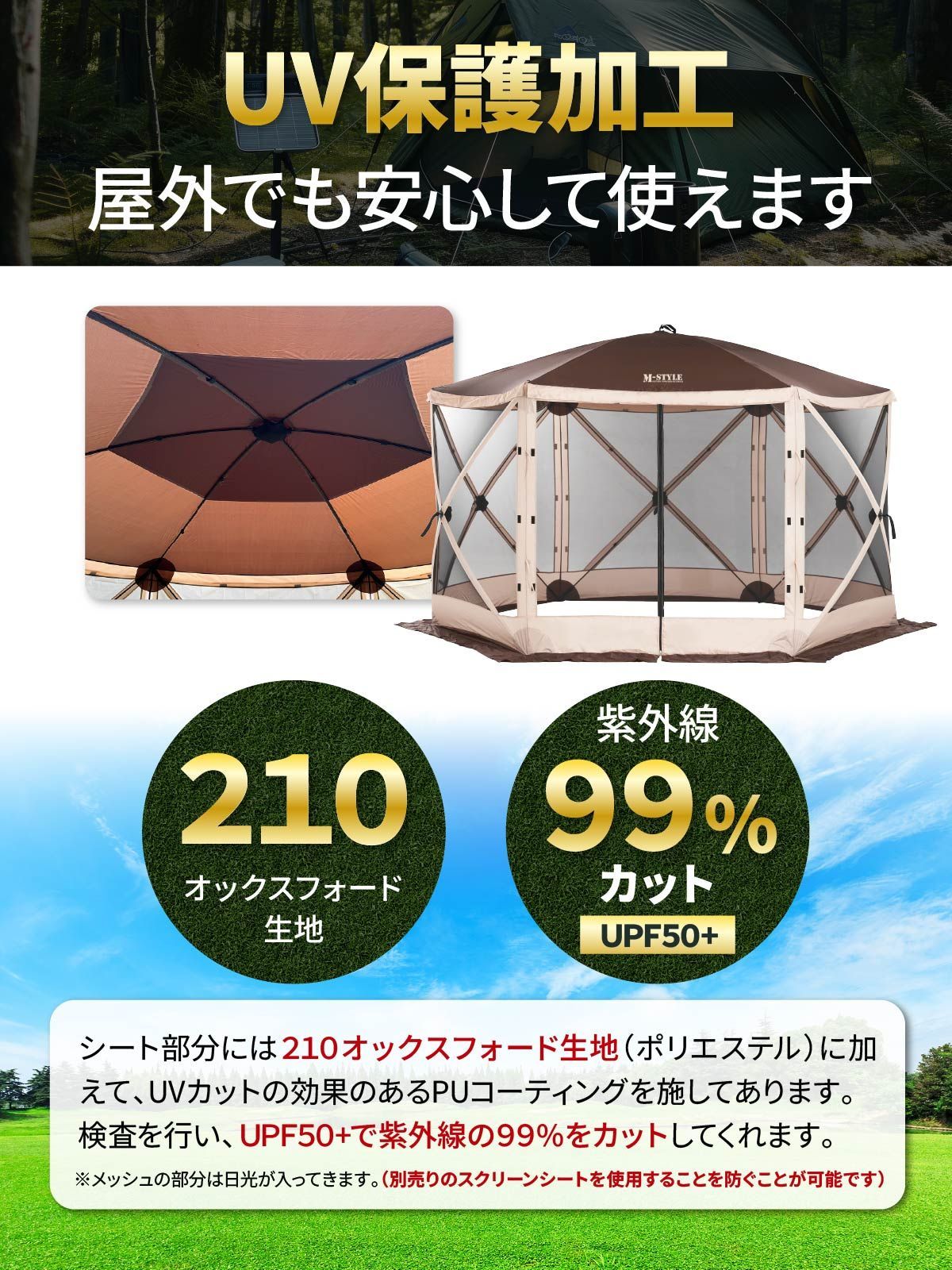 M STYLE サンシェード テント 6〜8人用 大型 六角 工具必要なし メッシュ キャンプ ピクニック アウトドア 運動会 日よけ 虫よけ 風よけ 紫外線対策 UPF 50 簡単設営 収納袋 ペグ ロープ 3 6