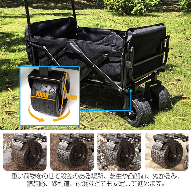 ■ ダブルフロントブレーキと360°回転キャスター付きの特大タイヤ(幅:約10cm、直径:約17cm)で、斜面、芝生、ビーチ、泥道、凹凸地面にも対応。坂道走行時にもブレーキが効き、荷物が滑りにくく、安全に移動できます。