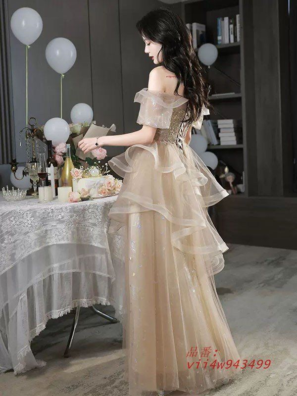 イブニングドレス 大人 ピアノ 発表会 ロングドレス アシンメトリードレス オフショルダー 肩出し 袖付き 成人式ドレス 演奏会用ドレス 二次会 フォーマル 披露宴 ワンピース Aライン パーティードレス シャンパン色 XS S M L 2L 3L 4L T2D7