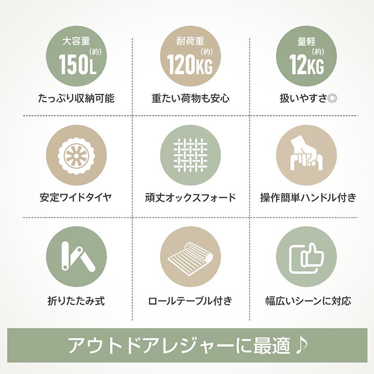 ■耐荷重120kg!重いギアや食材の運搬も安心です。